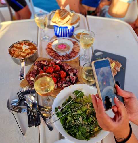 Kiedy jesteśmy w porcie lub na lądzie, jest również możliwość zjedzenia posiłku w lokalnej konobie lub tawernie. Zazwyczaj są to 2-3 wspólne kolacje w lokalnych restauracjach, a reszta posiłków serwowana jest na jachcie - w klimacie wspólnego, morskiego biesiadowania.